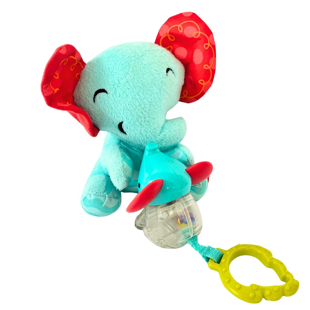 Slon s chrastítkem, kousátkem a šustítkem při zatahaní vibruje