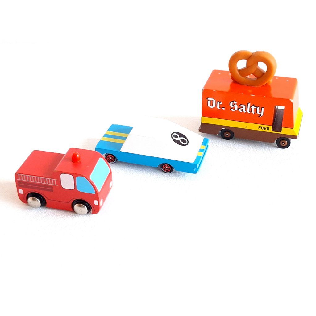 Obsahuje Dr. Salty Pretzel Van a Blue Racer #8. Vyrobeno z masivního buku s urethanovým lakem. Krásná hračka i stylová dekorace pro malé i velké sběratele.