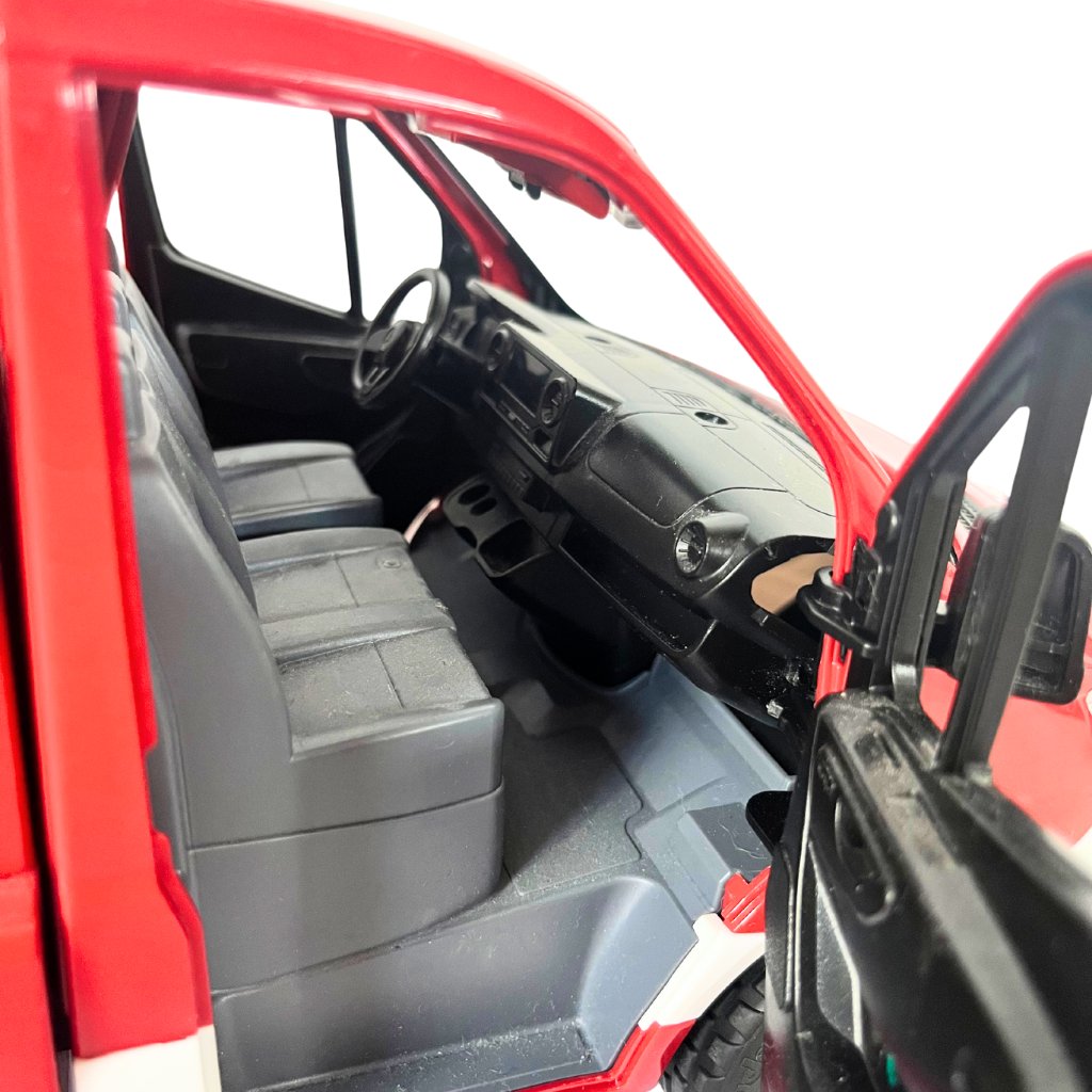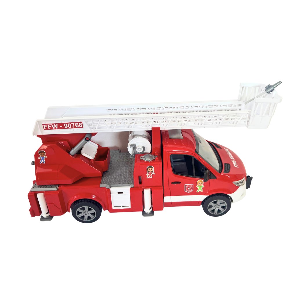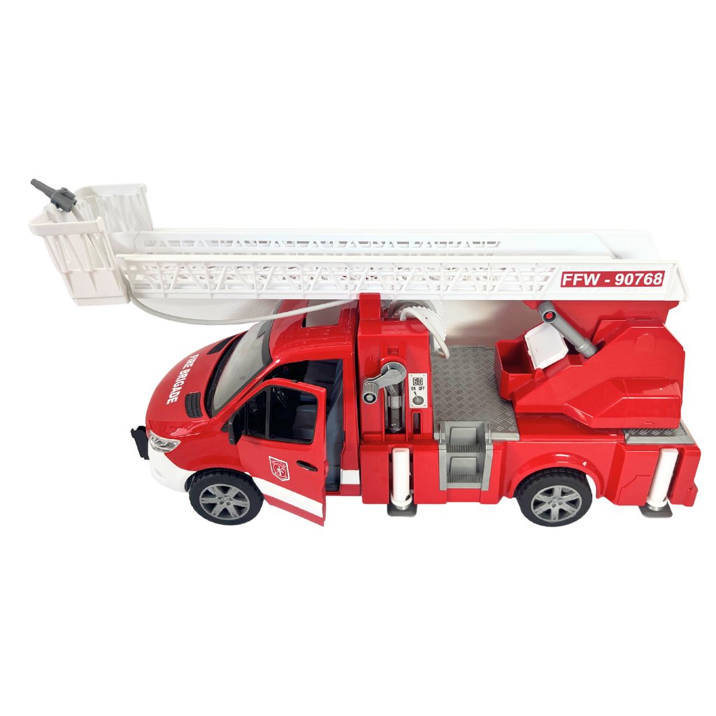 Prďácké, multifunkční hasičské auto s otevíracími dveřmi, výsuvným žebříkem, funkcí stříkání vody.