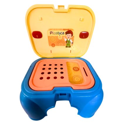 Plastová otevírací stolička s nářadím uvnitř, rozměry cca 32x23x18 cm. POZOR: ulomená...