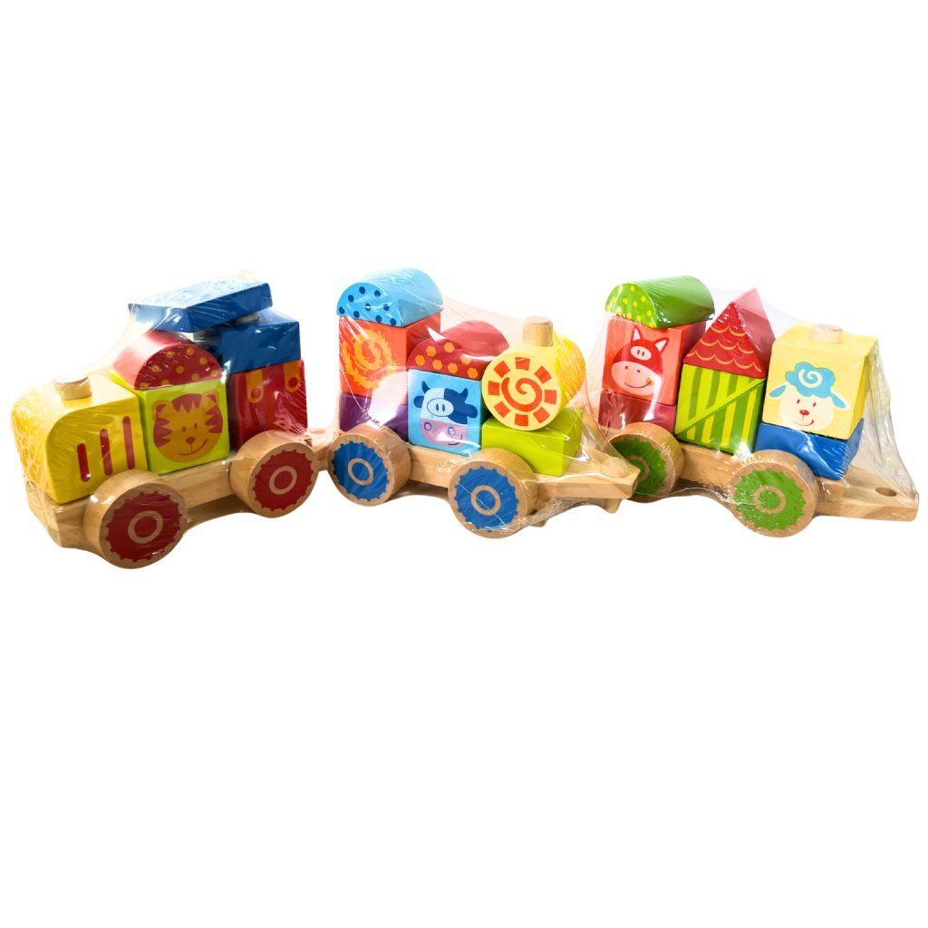 Tento krásný dřevěný vláček BABU je ideální hračka pro malé děti, které milují skládání, stavění a objevování barev. Vláček se skládá ze tří dřevěných vagónků a mnoha barevných kostek s různými tvary, vzory a ilustracemi zvířátek (kočička, prasátko, ovečka).