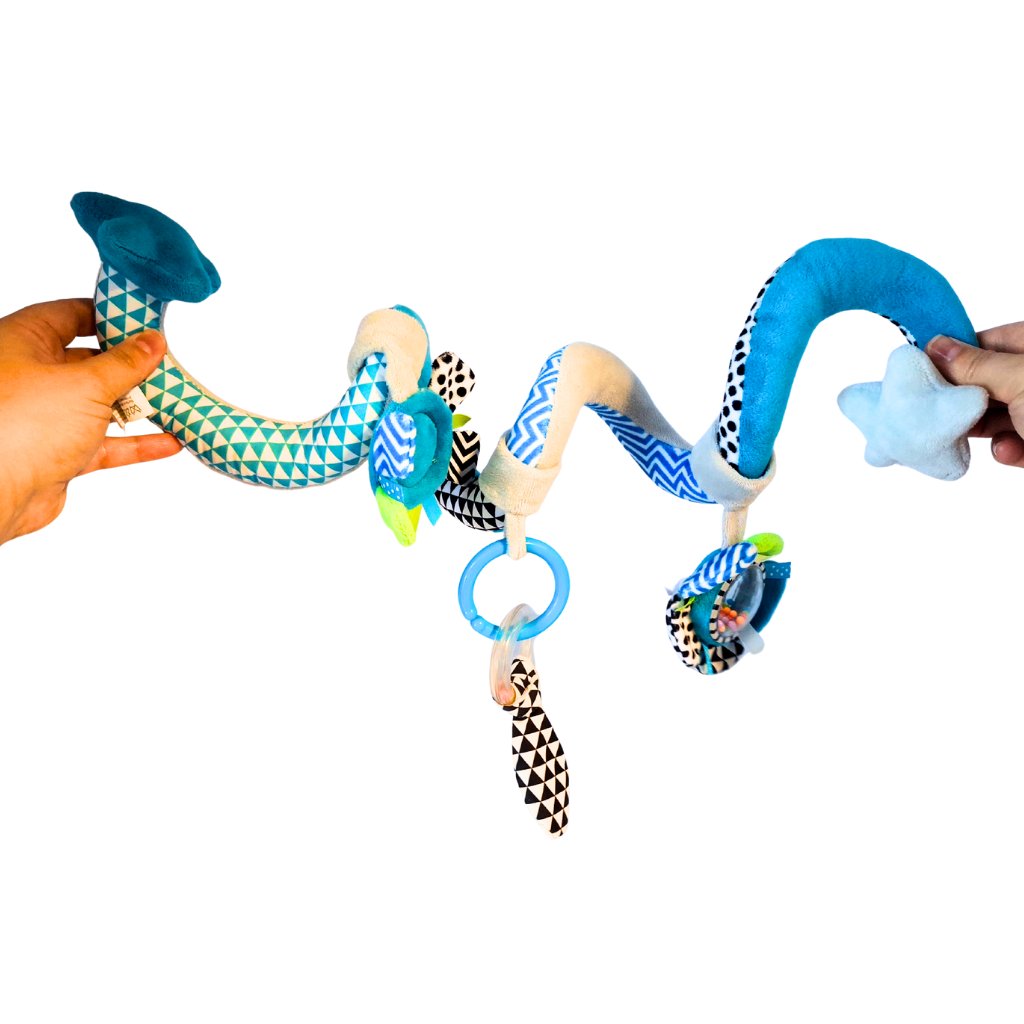 Barevná žirafa na jedné ponožce, pruhovaná zebra na ponožce druhé. Obě s chrastící...